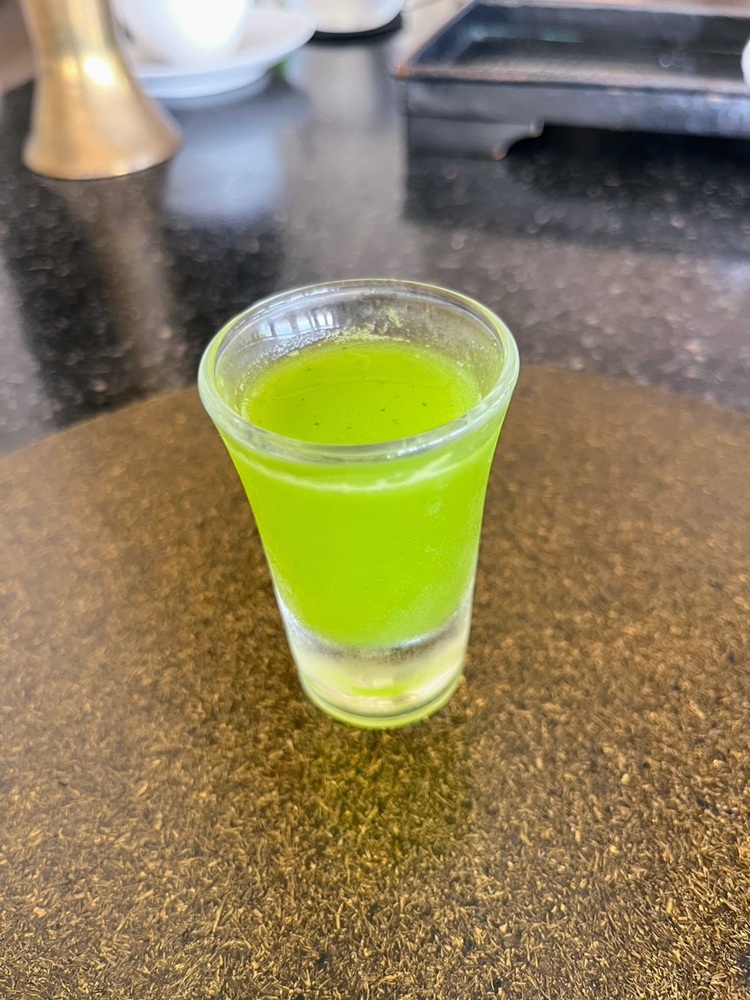「小さいグラスに入ったフルーツジュース」