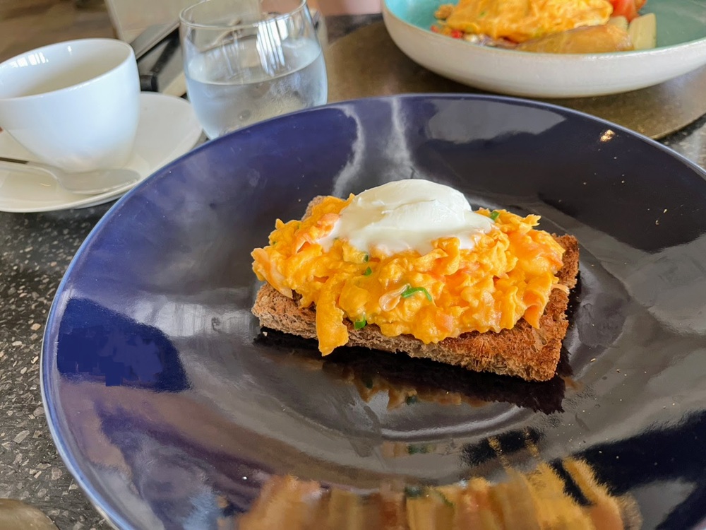 スクランブルエッグにはサーモンとネギが混ざっていて、上の白いクリームを付けるとまろやかになりました。
