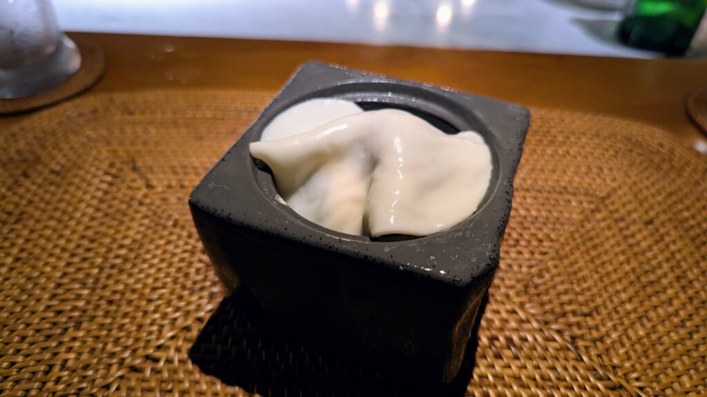 この白いのは薄いお餅みたいなもので、その下にアイスとチョコソースとココアクッキーが入っていました。