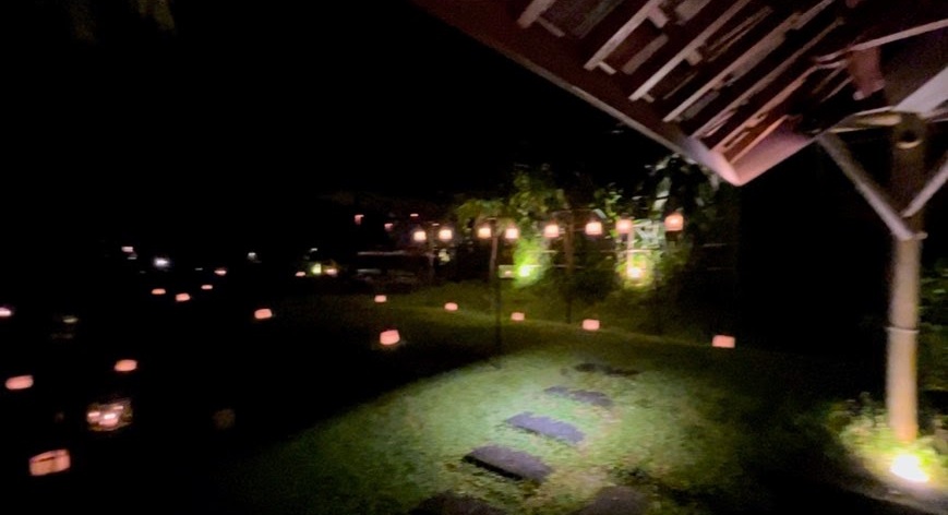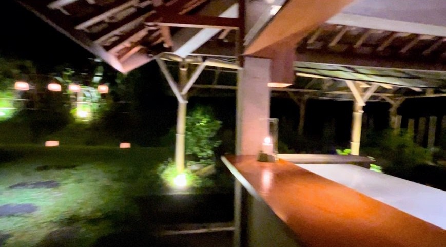 暗い道を先導していただき、プールを超えて、階段を降り、背の高い木々に囲まれた小道を抜けると、ライトアップされたスペースが見えてきました。