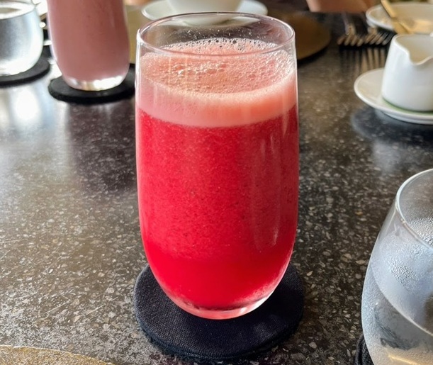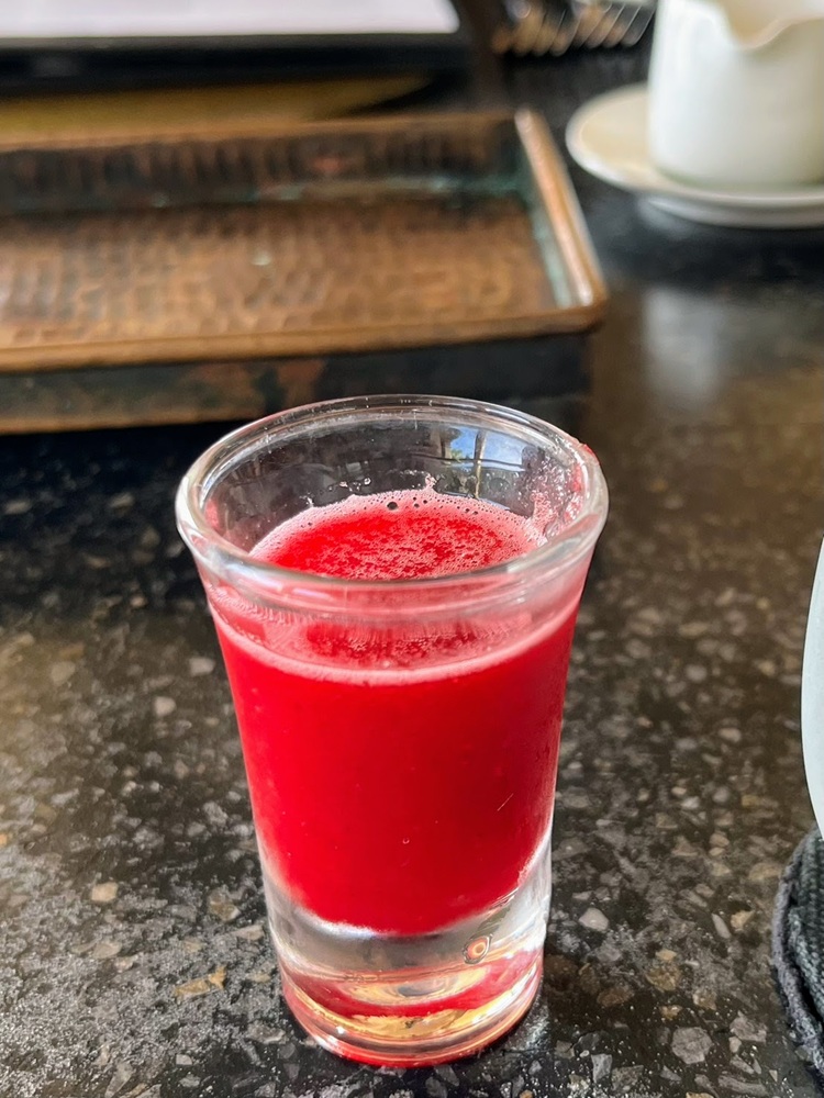 「小さいグラスに入ったフルーツジュース」