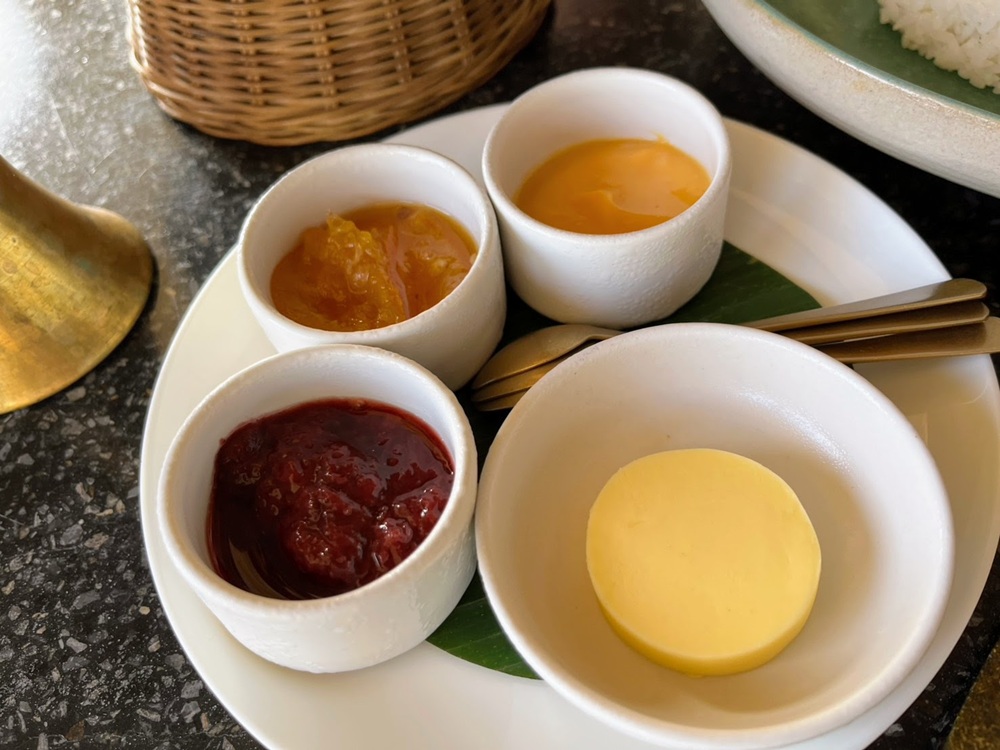 「バター、ストロベリーとオレンジのコンフィチュール、パッションフルーツソース」