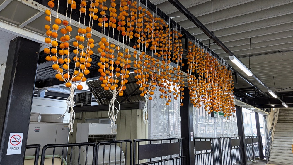 駅のホームには、たくさんの柿が干されていました。