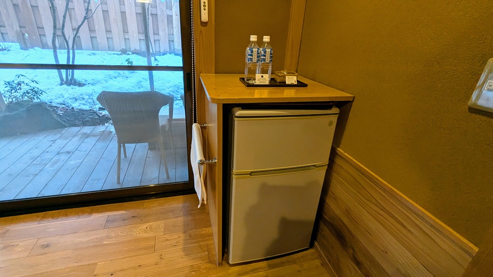 テーブルの後ろには、ミニバーがあります。