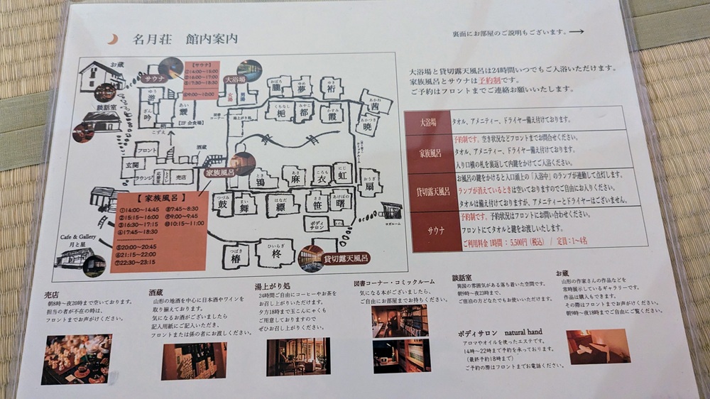 名月荘には20以上の客室があるようで、大浴場、サウナなど館内施設も充実しています。