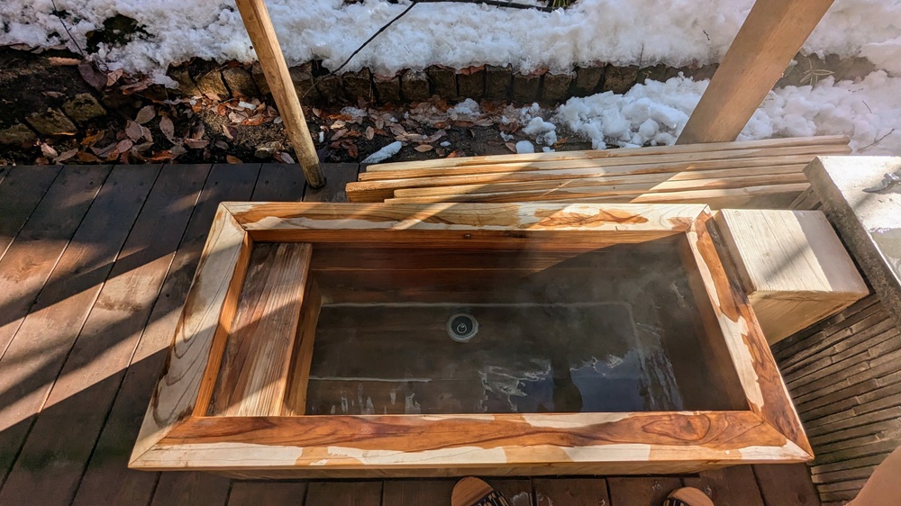 木の蓋を開けると、そこには温かな足湯が。