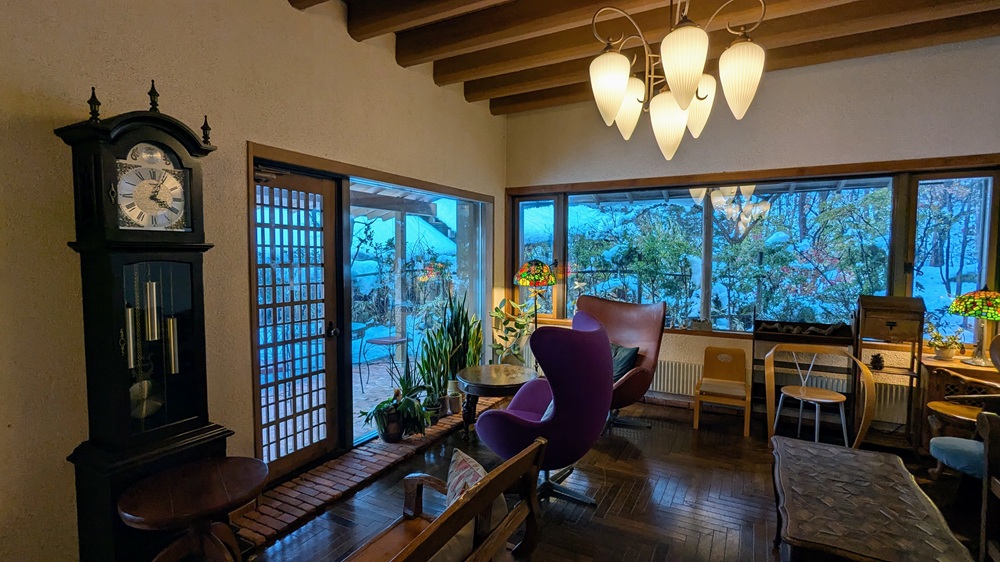 暖炉もあり、年季を感じさせる大きな時計、そして温かみのある照明。