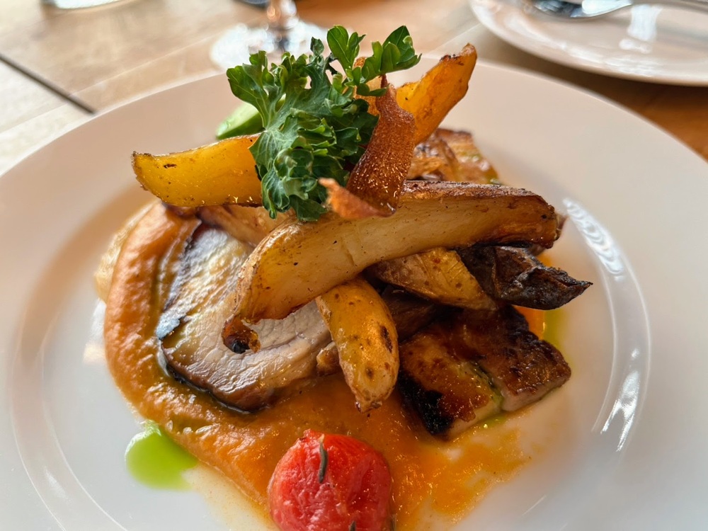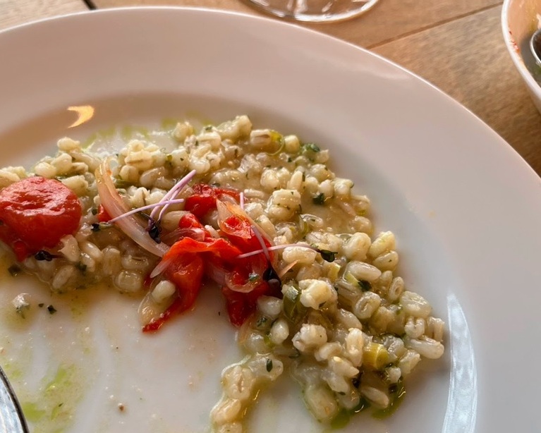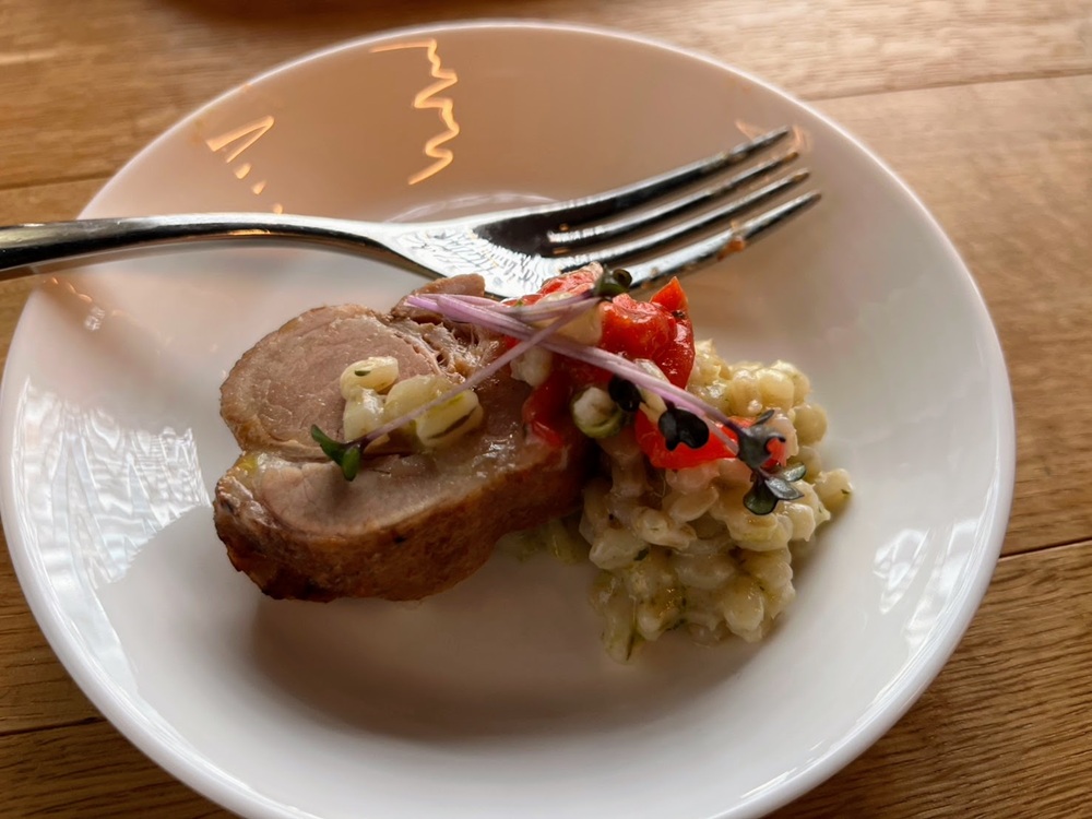 「バーチカ風大麦リゾット、豚肉のロースト」