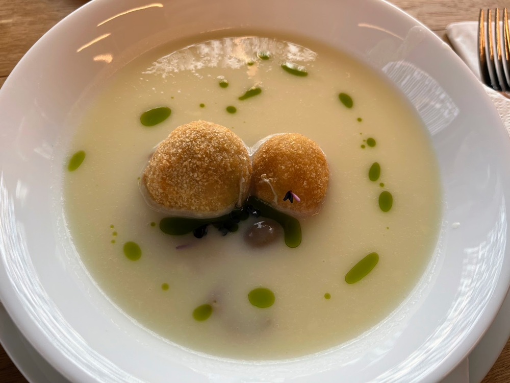 「ポロネギとポテトのクリームスープ、クリスピー野菜」