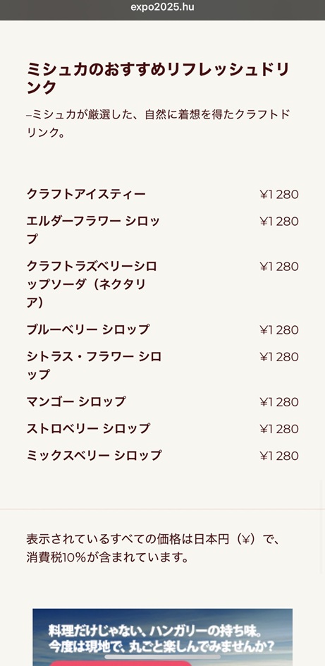 今回はハンガリー パビリオンに併設されているレストラン「ミシュカ キッチン&バー (Miska Kitchen & Bar)」です。